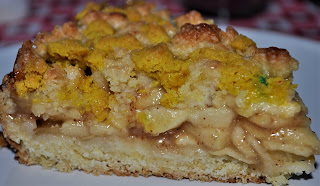 Per il ripieno: 2 grosse mele, cannella, buccia grattugiata di limone, 100 g di confettura di mele cotogne, succo di mezzo limone. Sbucciare le mele, tagliarle a cubetti, unire la confettura, il limone e la scorza e la cannella. Coprite con le briciole dell'impasto avanzato.