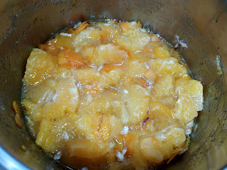 Mettete ora in una pentola le arance a pezzettoni (naturalmente toglierete prima i semi), le scorze, lo zucchero (dal quale avrete tolto i fiori) e la pectina. Fate cuocere per 3 minuti dall'inizio dell'ebollizione.
